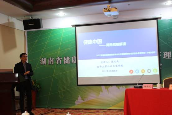 11月25日上午,2017年湖南省健康管理学会社区健康管理专业委员会学术年会于岳阳市阿波罗御庭酒店成功举行。湖南省健康管理学会秘书长易志远、健康管理学会社区健康管理专业委员会主任委员刘爱忠与会,参会代表共60余人。活动开幕式由副主任委员吴成秋教授主持,学术报告由副主任委员杨福炎主持,公司党委书记张天成作题为“健康中国---湖南战略解读”的主题报告。