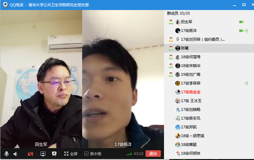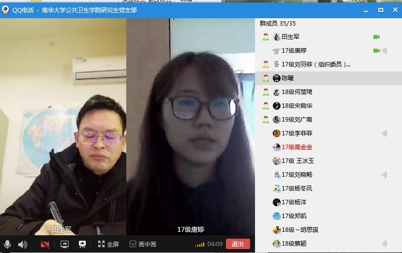 另外,其他党员也都表示将会牢记并遵守党中央以及公司的防控指示,将会更加努力学习自己的专业知识,希望可以在今后从事公共卫生事业工作中,尽自己所能去帮助更多的人,全心全意为人民的健康事业服务。最后,田书记进行了总结,他首先肯定了此次活动的顺利召开以及大家发言的积极性,内容丰富,收获颇多,希望大家会后将讲话全文更深入思考,认真领会习近平总书记的讲话精神,提高自己的认识和理解水平,争做一名有责任感、有担当、有专业思维和大局意识的“公卫人”,同时,强调党员干部要带头做好每天健康打卡工作,对于研一有网络课堂的同学要认真按照公司公司要求,在家认真完成学习,对于即将毕业的研三同学,在家里认真完成自己的毕业论文,及时关注线上的就业单位和招聘通知,特殊时期,对三会一课以及党日活动的召开要有计划,定时召开。