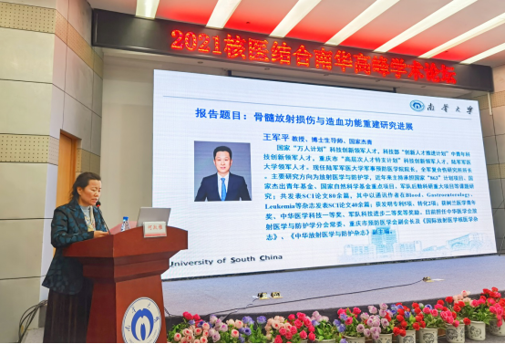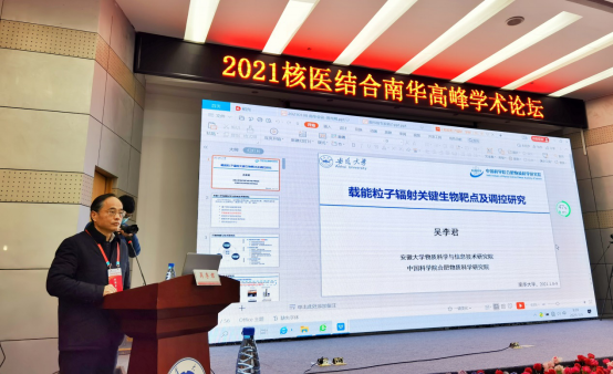 开幕式后,各位专家分享了他们的研究成果。国家杰青、安徽大学吴李君教授围绕“载能粒子辐射关键生物靶点及其调控研究”做主题报告,介绍了基于靶学说的肿瘤放疗和辐射防护等领域的研究进展,分享了基于肿瘤放疗靶点多组学dbCRSR数据库的放疗新基因靶点及其调控机制研究,介绍了与线粒体相关的放疗增敏药物及染色质构象等因素对辐射增敏的影响、物理靶点与生物靶点的关联等方面的研究成果。国际宇航科公司院士、苏州大学周光明教授围绕“空间辐射致癌效应及LncRNA的调控作用”做主题报告,介绍了空间辐射的健康风险与待解决的关键科学问题,分享了空间辐射致癌生物效应分子机制及LncRNA调控作用等方面的研究成果。国家杰青、陆军军医大学王军平教授围绕“骨髓放射损伤与造血功能重建研究进展”做主题报告,从临床放射损伤入手,探讨了骨髓放射损伤及造血功能重建的研究进展。军事科公司军事医学研究院王治东教授围绕“放射生物剂量学研究进展”做主题报告,介绍了生物计量学研究需求与难点,分享了生物剂量估算技术研究进展与前沿。长江学者特聘教授、国家杰青、中国医学科公司/北京协和医公司樊赛军教授以“放射损伤防护与救治研究新进展”为题做了线上报告,介绍了肠道菌群在放疗相关的放射性损伤诊治与防护中的作用,分享了肠道菌群与辐射损伤关系等方面的研究成果。国家杰青、中山大学唐亚梅教授以“放射性脑损伤机制与诊疗”为题做了线上报告,探讨了神经胶质细胞活化、神经血管单元损伤及神经突触稳态变化等因素与放射性脑损伤的关系,分享了放射性脑损伤诊疗研究成果与前沿。