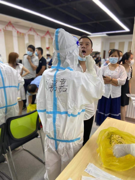 此次工作任务繁重,检测人员需要在6月20日晚至22日晚3天时间内完成全区约120万人口的核酸采样工作。beats365实习队员在紧急培训后,迅速投身到抗疫一线工作中。他们每天穿着厚厚的防护服,顶着35摄氏度的高温天气,争分夺秒地为社区居民进行核酸检测。他们吃饭的时间都是从工作中挤出来的。在高温环境下,穿上防护服两分钟后衣服便会被汗水浸湿。他们每次脱下防护服时,被护目镜和口罩勒得深深的印痕和被汗水浸得发白的手指清晰可见。尽管条件十分艰苦,但他们没有丝毫退却,而是坚定地坚守在岗位上。其中,实习队员刘嘉嘉因高温炎热出现中暑症状几乎晕倒,被搀扶离开休息片刻后,又不顾劝阻毅然回到自己的工作岗位上。刘嘉嘉说:“虽然高温酷暑,汗衣加身,但作为一名抗疫战士,自己的初心和使命,始终是守护人民群众的健康!”