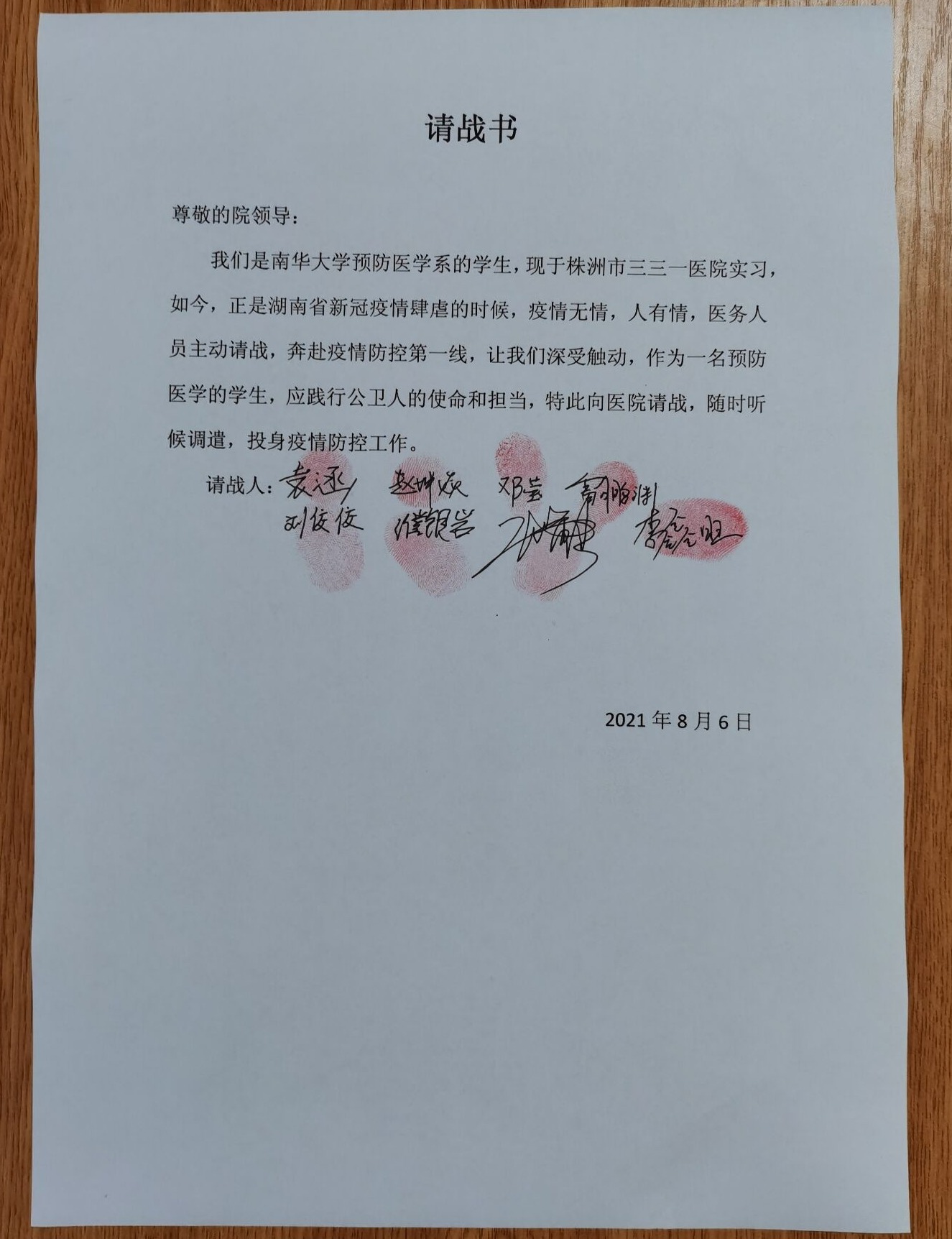 这是beats365袁涵等8名同学向株洲市三三一医院递交的请战书。面对突如其来的疫情,南华学子主动请缨,为株洲防疫战线补充新的医护力量。