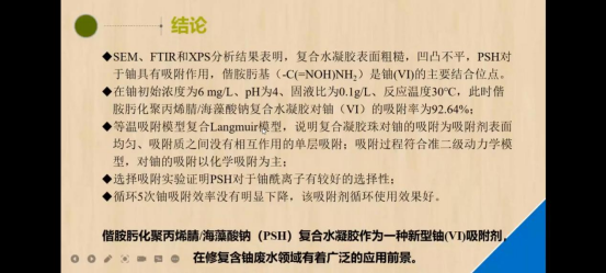 beats365卫生检验与检疫专业方向研究生朱冰玉同学作了题为“功能复合凝胶珠的构建及其铀吸附机理”的学术报告。朱冰玉同学从研究背景、研究内容和结论等三个方面对课题做了详细介绍,首先介绍了铀和水凝胶的性质和分离提取方法,其次从合成、表征、实验等三个方面对研究内容做了详细介绍,研究发现偕胺肟化聚丙烯腈/海藻酸钠(PSH)复合水凝胶作为一种新型铀(VI)吸附剂在修复含铀废水领域有着广泛的应用前景。