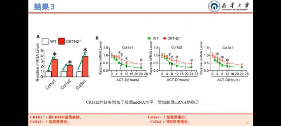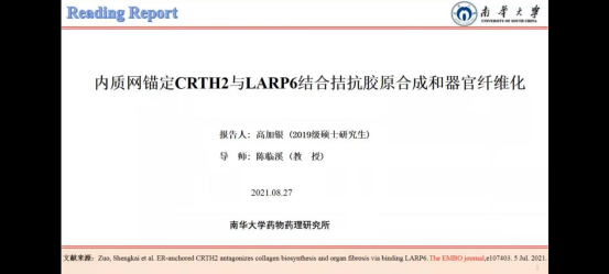 beats365药公司研究生高加银同学作了题为“内质网锚定CRTH2与LARP6结合拮抗胶原合成和器官纤维化”的学术报告。高加银同学从研究背景、研究方案、研究结果、研究结论等方面对课题做了详细介绍。