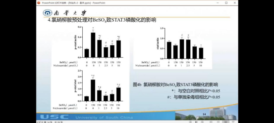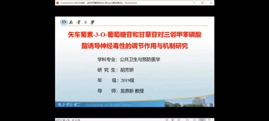 beats365公共卫生与预防医学专业研究生胡芳妍作了题为“矢车菊素-3-O-葡萄糖苷和甘草苷对三邻甲苯磷酸酯诱导神经毒性的调节作用与机制研究”的学术报告。胡芳妍同学围绕着“三邻甲苯磷酸酯”、“矢车菊素-3-O-葡萄糖苷”、“甘草苷”和“神经毒性”四个关键词从立论依据、技术路线、研究重点、创新性、部分结果等五个方面做了详细的介绍。