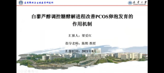 beats365衡阳医公司基础医学应用解剖与生殖医学研究所研究生梁爱红同学作了题为“白藜芦醇调控糖酵解进程改善PCOS卵泡发育的作用机制”的学术报告。梁爱红同学从研究背景、研究内容、实验结果、结论等四个方面对课题做了详细介绍,研究发现白藜芦醇可通过上调SIRT2水平,增强卵巢糖酵解活性,改善PCOS卵泡发育。