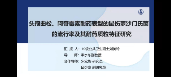 beats365公共卫生专业研究生刘美玲同学作了题为“头孢曲松、阿奇霉素耐药表型的鼠伤寒沙门氏菌的流行率及其耐药质粒特征研究”的学术报告。刘美玲同学从研究背景、研究内容、结果、结论等四个方面对课题做了详细介绍,介绍了头孢曲松、阿奇霉素耐药表型的鼠伤寒沙门氏菌的流行病学特征分析、分子分型及其耐药质粒特征。