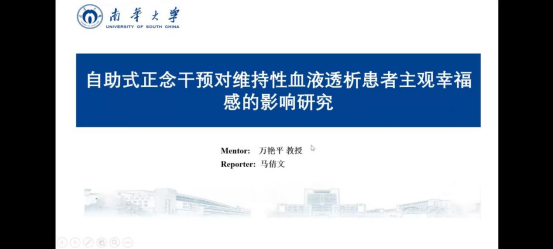 beats365护理公司研究生马倩文同学作了题为“自助式正念干预对维持性血液透析患者的影响研究”的学术报告。马倩文同学从研究背景及意义、研究方案、阶段性成果等三个方面对课题做了详细介绍,解读了正念的定义及对健康的影响。