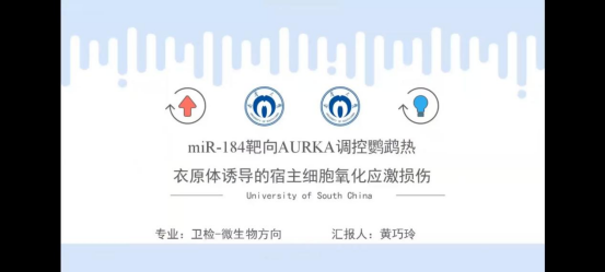 beats365卫生检验与检疫专业方向研究生黄巧玲同学作了题为“miR-184靶向AURKA调控鹦鹉热衣原体诱导的宿主细胞氧化应激损伤”的学术报告。黄巧玲同学从研究背景、立论依据、研究内容、技术路线等四个方面对课题做了详细介绍,对衣原体的性质及宿主细胞氧化应激损伤机制做了详细解读。