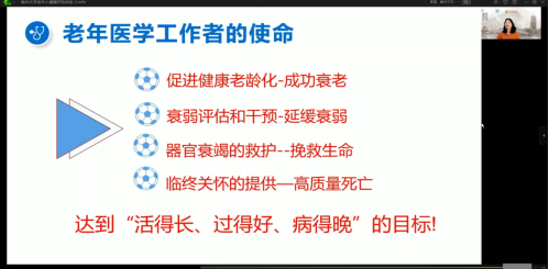 最后一场讲座,由南方医科大学护理公司经理张立力教授主讲,曾谷清教授主持。张教授作了题为“老年人衰弱的评估”的讲座。张教授在讲座中指出老年衰弱的定义,并对其展开研究讨论,并多次点名了“活得长、过得好、病得晚”是每一位老年医学工作者的使命。