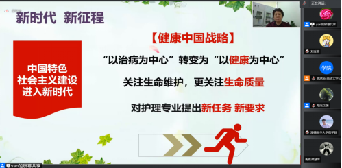 上午8:30,北京协和医院护理公司副经理吴欣娟教授作了题为“新形势下护理专业变革与发展”的专题讲座,本场讲座由公司护理公司经理廖力教授主持。吴教授首先对护理专业做了初步介绍,描述其由“幼稚”转向“成熟”的过程,并对护理专业的发展及其前景做了概括和展望,吴教授还点明了“健康新中国战略”的新时代理念,从“以治病为中心”转变为“以健康为中心”,关注生命维护的同时,更应该关注生命质量,最后,吴教授针对学员的提问进行了网上答疑,使师生受益匪浅。