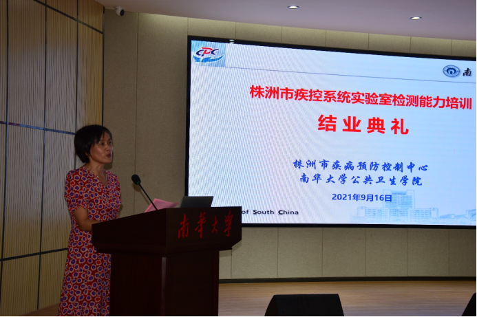 结业典礼由杨慧仙副经理主持,首先由陈丽丽教授作了《卫生检测技术在实际工作中的应用》主题报告,介绍了卫生检测行业发展和新技术的应用。