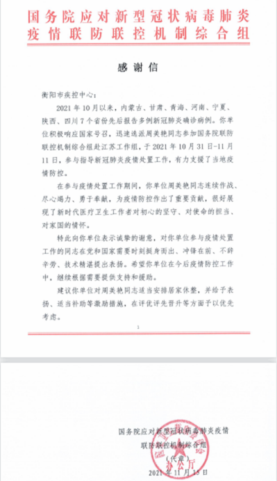 近日,衡阳市疾病预防控制中心收到国务院应对新型冠状病毒肺炎疫情联防联控机制综合组的一封表扬公司员工周美艳的感谢信,信中评价:“你单位周美艳同志连续作战、尽心竭力、勇于奉献,为疫情防控作出了重要贡献,很好展现了新时代医疗卫生工作者对初心的坚守、对使命的担当,对家国的情怀。”