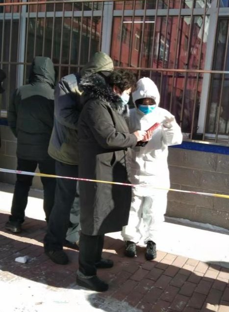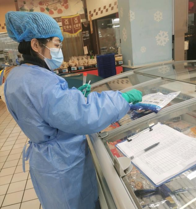图为王艺璇对冷链食品进行核酸检测 图为黄钰洁在商场的进口处督促来访人员流动记录