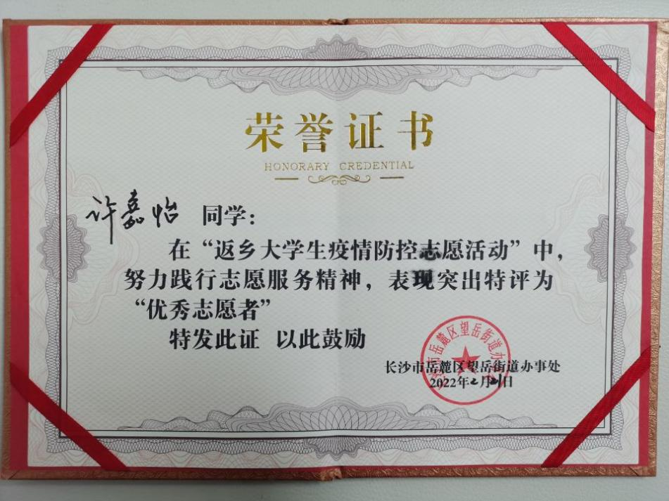 许嘉怡在长沙望岳街道社区卫生服务中心执勤,积极做好扫健康码、测体温、维持秩序、帮助他人预约新冠疫苗加强针等志愿工作,表现突出,获得“优秀志愿者”荣誉称号。魏伊璇在隔离酒店温暖坚守,对每一个入住的隔离人员做个人档案动态记录,进行早晚两次测温,关注他们的健康状况及时联系疫情指挥部把状况恶化的人员转诊到医院接受治疗。陈欣欣、黄涛等同学在高速公路出口归阳收费站站岗,查验往来车辆车上全体人员健康码行程码及核酸检测报告,测量体温,督促省外未做核酸检测的返乡人员进行现场核酸检测。吕奕霖、曾娅玲、祖语、刘龙啸等志愿者们在社区参与返乡人员信息登记录入、全民核酸装样、封箱准备工作等。