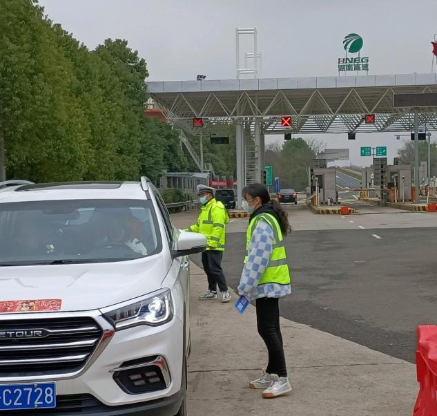 图为陈欣欣于高速公路口进行执勤 图为黄涛同学在关卡口执勤与志愿者老兵合影