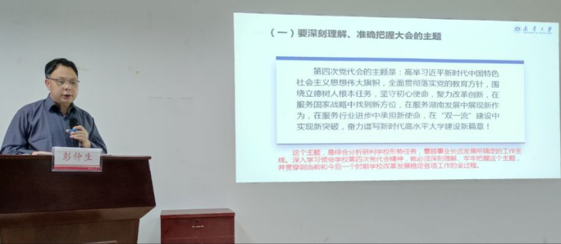 首先,由公司宣讲团成员、校纪委副书记彭仲生宣讲第四次党代会精神。彭仲生用生动的文字、图片从第四次党代会概况、第四次党代会报告产生过程和框架结构、深刻领会和准确把握第四次党代会的精神实质(5个深刻领会和准确把握)和全面抓好第四次党代会精神的落地落实等四个大的方面向大家进行了党代会精神的宣讲和详细解读,内容全面,站位很高,精准细致,深入浅出、给人启迪和奋进。彭仲生表示,未来五年,是公司建设新时代高水平大学的关键五年。朝着跻身国家“双一流”高校行列的目标,我们要更加紧密地团结在以习近平同志为核心的党中央周围,坚守初心使命,聚力改革创新,在“双一流”大学的赛道上奋力奔跑,跑出属于我们南华人的精彩未来! 彭仲生强调要把全体党员干部和广大师生员工的思想统一到大会精神上来,把各方面的智慧力量凝聚到实现奋斗目标上来,以更加坚定的信心、更加昂扬的斗志、更加务实的作风,奋力开创新时代高水平大学建设新局面,具有重要意义。