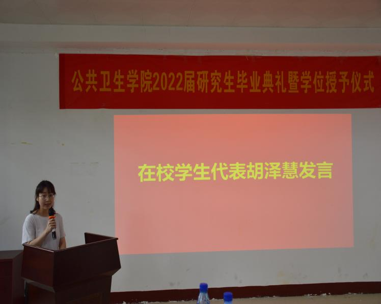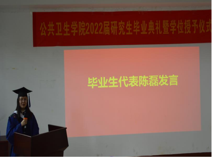 随后,毕业生代表陈磊,在校员工代表胡泽慧发言。陈磊回望研究生3年披星戴月的拼搏时光,南华有太多深情镌刻的记忆,这些都将成为人生旅途弥足珍贵的牵挂和陪伴。陈磊表示,她们一定会坚守公卫人的使命,为祖国的现代化事业贡献出自己的力量。胡泽慧向2022届顺利完成学业的师兄师姐们,表示了最热烈的祝贺和最真挚的祝福,同时也对师兄师姐们两年来帮助表示感谢。并表示定将传承beats365的精神,从容面对未来科研生活,带好下一届师弟师妹。