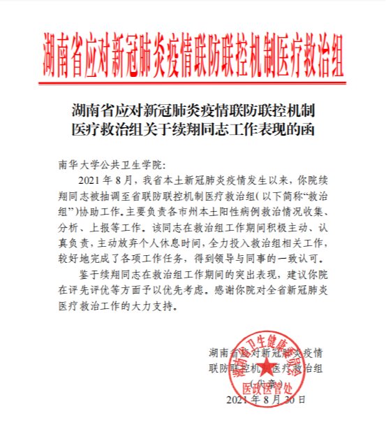 2021年湖南省本土新冠肺炎疫情发生以来,续翔积极参与了湖南省卫生健康委员会省联防联控机制医疗救治组协助工作。负责2021年8月、2022年2月各市州本土阳性病例救治情况收集、分析、上报等工作。