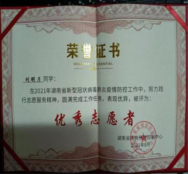 2021年2月,刘明月在乌鲁木齐天山区东环西路西社区参加抗疫志愿者活动,主要协助社区工作人员对居民采集核酸。2021年7月和2022年3月,她在湖南省疾控中心食安科老师的带领下两次加入新冠肺炎疫情防控指挥部信息专班,主要负责创作并绘制湖南省本土疫情传播链条图。2021年9月-12月,她参与多起进口冷链食品新冠阳性事件的调查处置工作。经过多次疫情防控的实战历练,把自己所学的理论知识同实践很好的结合起来,更好地为今后在疾控实习及未来的工作打下基础。