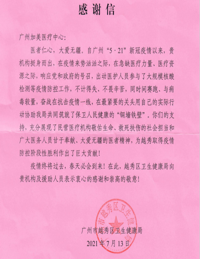 2021年5月,广州新型冠状病毒疫情爆发,在急缺医疗力量、医疗资源之际,2021级研究生陈子杰代表工作单位广州加美医疗中心,到越秀区华乐街道卫生社区服务中心参加核酸采样,信息登记等志愿工作7天。广州市越秀区卫生健康局写感谢信对本人工作单位广州加美医疗中心表示衷心的感谢。