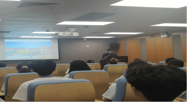 欢迎仪式结束后,澳门大学健康科学公司黄冠豪教授给同学们作“基因与生物信息学基础与前言介绍”专题讲座,同学们听讲认真,积极用英语与黄冠豪教授互动。
