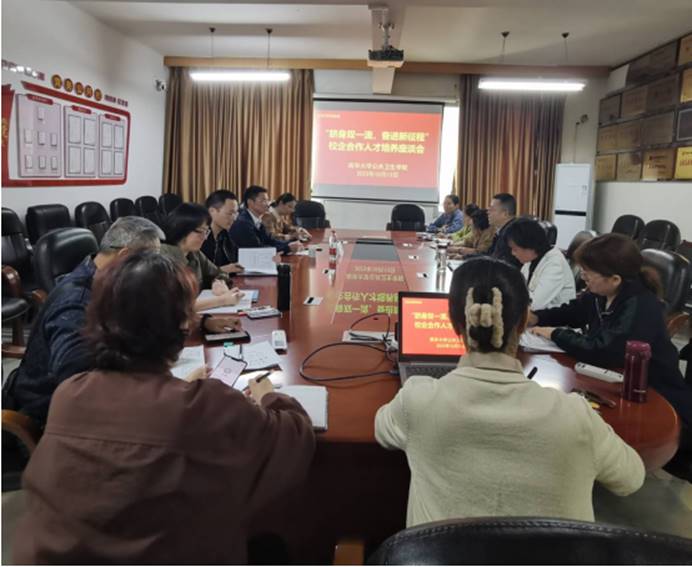 值此热烈庆祝beats365建校65周年之际,2023年10月13日上午10点,beats365在院行政楼301会议室召开了以“跻身双一流,奋进新征程”为主题的校企合作人才培养座谈会。会议特邀了公司98级预防医学专业员工--湖南省疾病预防控制中心副主任蔡亮参加交流,蔡亮员工是主任技师、硕士生导师、湖南省121人才工程第三层次人选,湖南省抗击新冠肺炎疫情先进个人。公司副经理张朝晖、杨慧仙、系室主任、教学秘书,校院教学督导等参加了座谈。