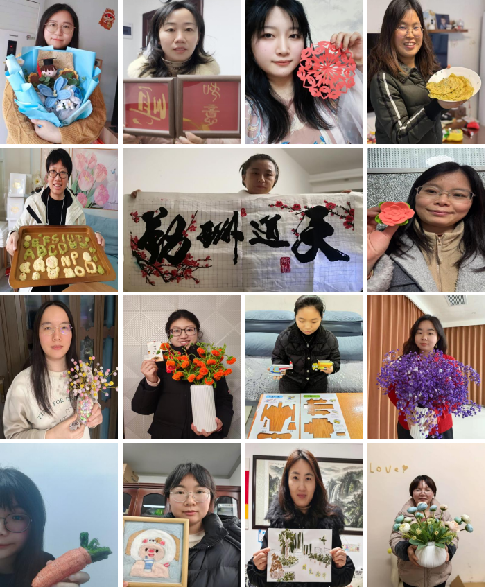 活动发布后,女教职工们踊跃报名,以手工创作的形式庆祝属于自己的节日。活动形式多样,涵盖了手工花、插花、剪纸、折纸、刺绣、针织、涂鸦、书法、绘画、烘焙、厨艺等多种艺术形式。每位参与者都充分发挥了自己的创意与巧思,展现了她们在繁忙工作之外的多才多艺与生活情趣。