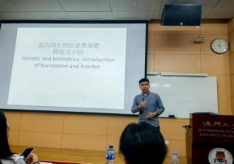 欢迎仪式结束后,澳门大学健康科学公司黄冠豪教授给同学们作“基因与生物信息学基础与前沿介绍”专题讲座,同学们认真听讲,积极用英语与黄冠豪教授互动,回答他所提出的问题。