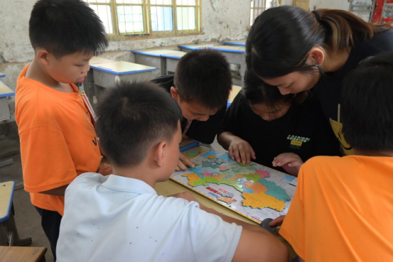 地图拼图环节里,孩子们围坐成圈,在志愿者的引导下将散落的地图模块逐一拼接。从勾勒雄鸡形状的国土轮廓,到标注长江、黄河的奔流轨迹,从辨认青藏高原的雪域风光到东海之滨的辽阔海域,志愿者结合拼图讲解:“我们的祖国有960万平方公里土地,有多样的地形地貌,这是我们共同的家园。”当完整的中国地图在孩子们手中呈现,他们指着湖南的位置骄傲地说:“我们在这里!”小小的拼图让孩子们认识了祖国的山河辽阔。
