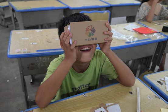 “想不想‘亲眼’看看祖国的美景?”VR体验课上,志愿者的提问点燃了孩子们的期待。孩子们在指导下专注完成硬纸板剪裁、凸透镜安装、手机支架固定等每个步骤。戴上自制眼镜后,《最美中国》的沉浸式内容让孩子们发出阵阵惊叹:“长城像巨龙一样!”“桂林山水好漂亮!”“布达拉宫在云朵里!”通过科技手段,孩子们“走遍”大江南北,直观感受祖国的壮丽景色。