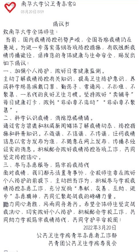 由于近期湖南疫情形势严峻,为保护师生安全,提高师生疫情防控意识,公司团委特举办“疫情防控倡议活动”,在线上发倡议书、疫情知识宣传手册等,向全校师生普及当前疫情形势以及防控注意事项。
