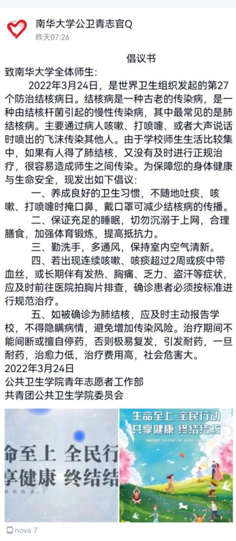 为加强肺结核知识的宣传普及,呼吁广大师生重视肺结核的防控,营造健康和谐的校园环境,公司团委特于第27个世界防治结核病日举办“生命至上,全民行动,共享健康,终结结核”宣传活动。