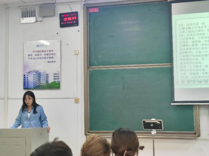 紧接着,李亦晴同学分享了她的英语复习方法和专业课的复习策略。她建议我们应根据自身情况选择目标院校,并参考学长学姐们的成功经验,制定适合自己的学习计划。她的分享主要分为初试和复试两大板块,详细阐述了英语、卫生综合与政治的学习计划与建议。她还鼓励我们调整心态,全力以赴,并在复试时随机应变,展现自信和大方。