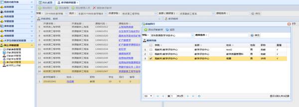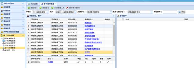 1.公司教学办、系(教研室)人员登录教务在线账号后,点击“网上评教管理”下的“参评教师管理”菜单项,然后在页面右边选择“学期、批次、开课公司”等参数,然后点击“确定”后下面会显示符合条件课程,然后双击要添加评教老师的课程,课程会呈现在下面一栏。