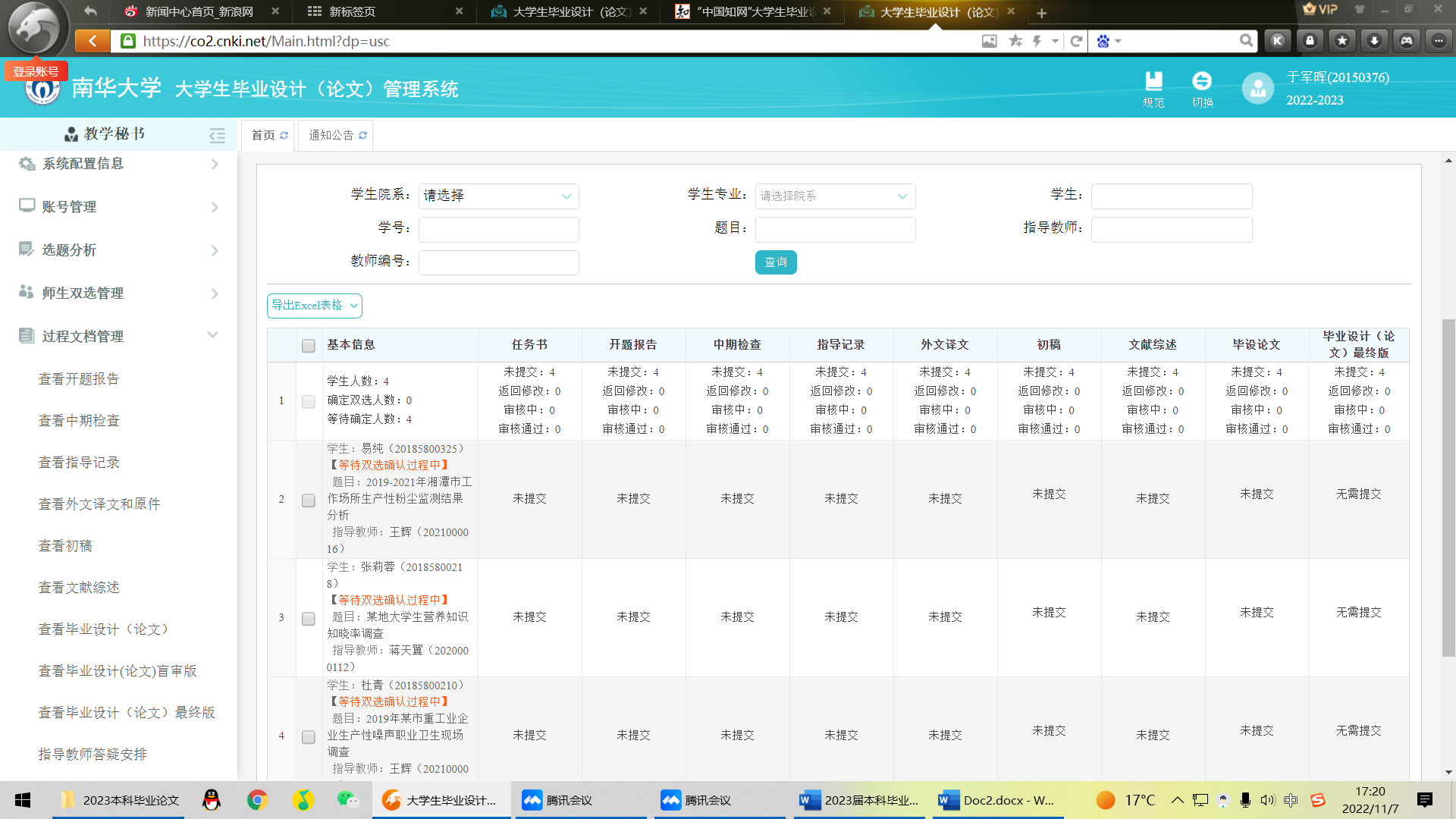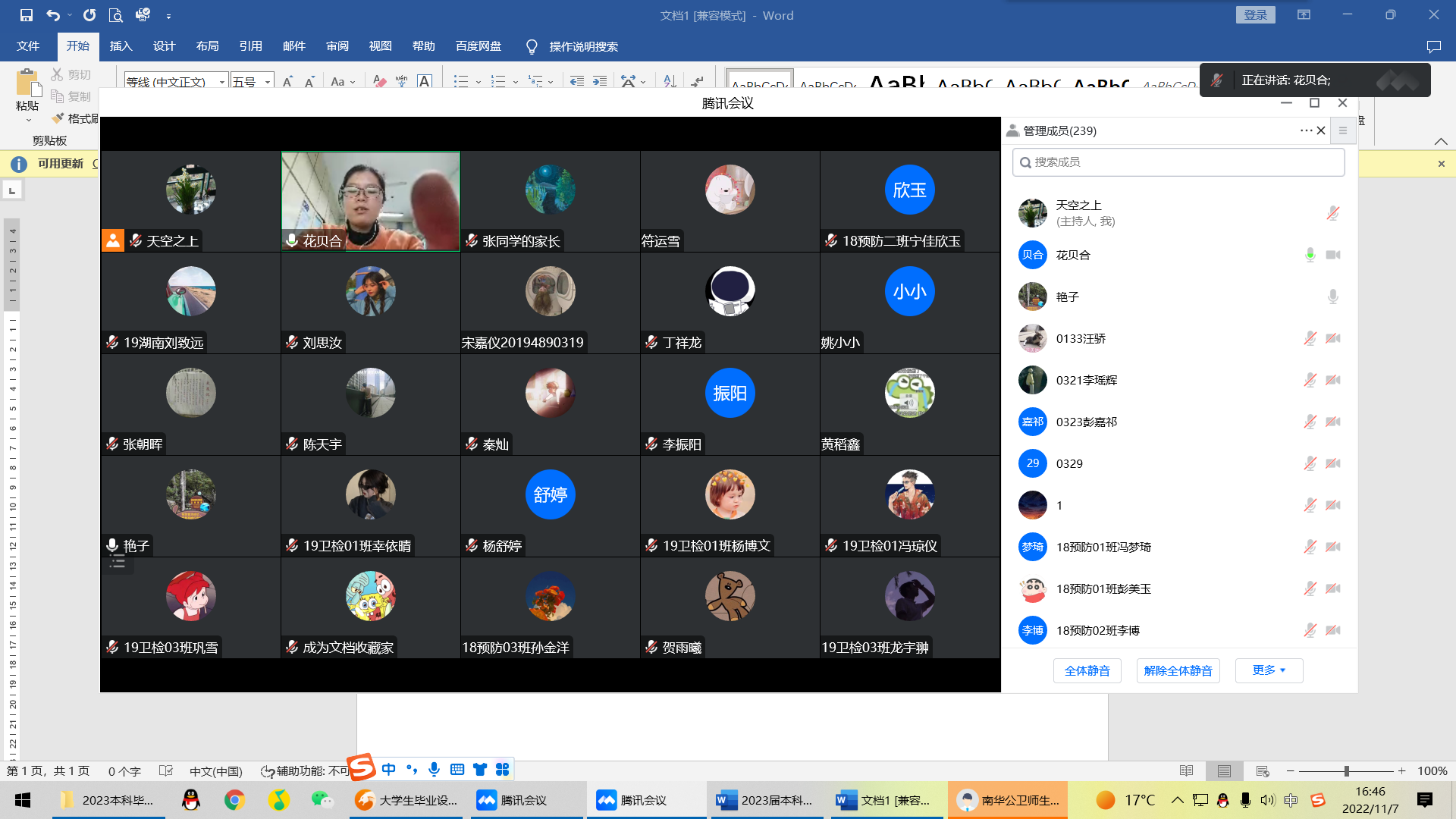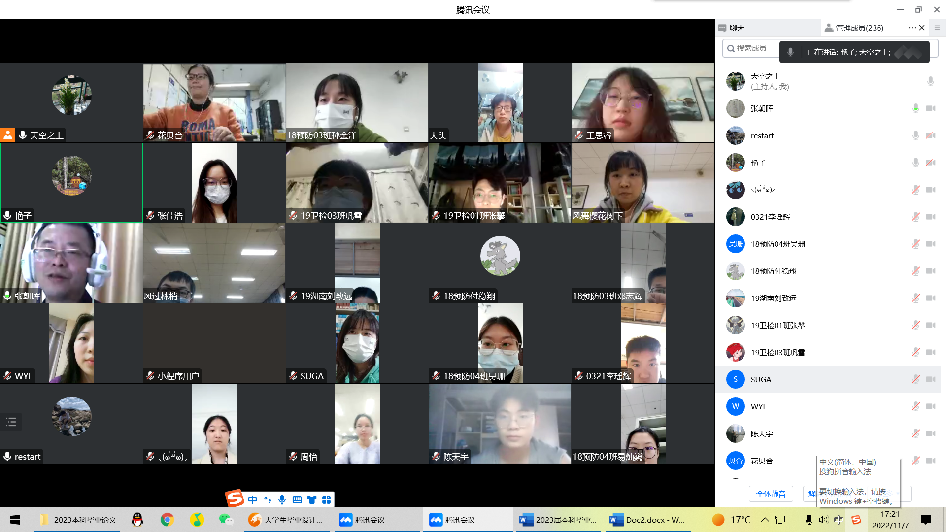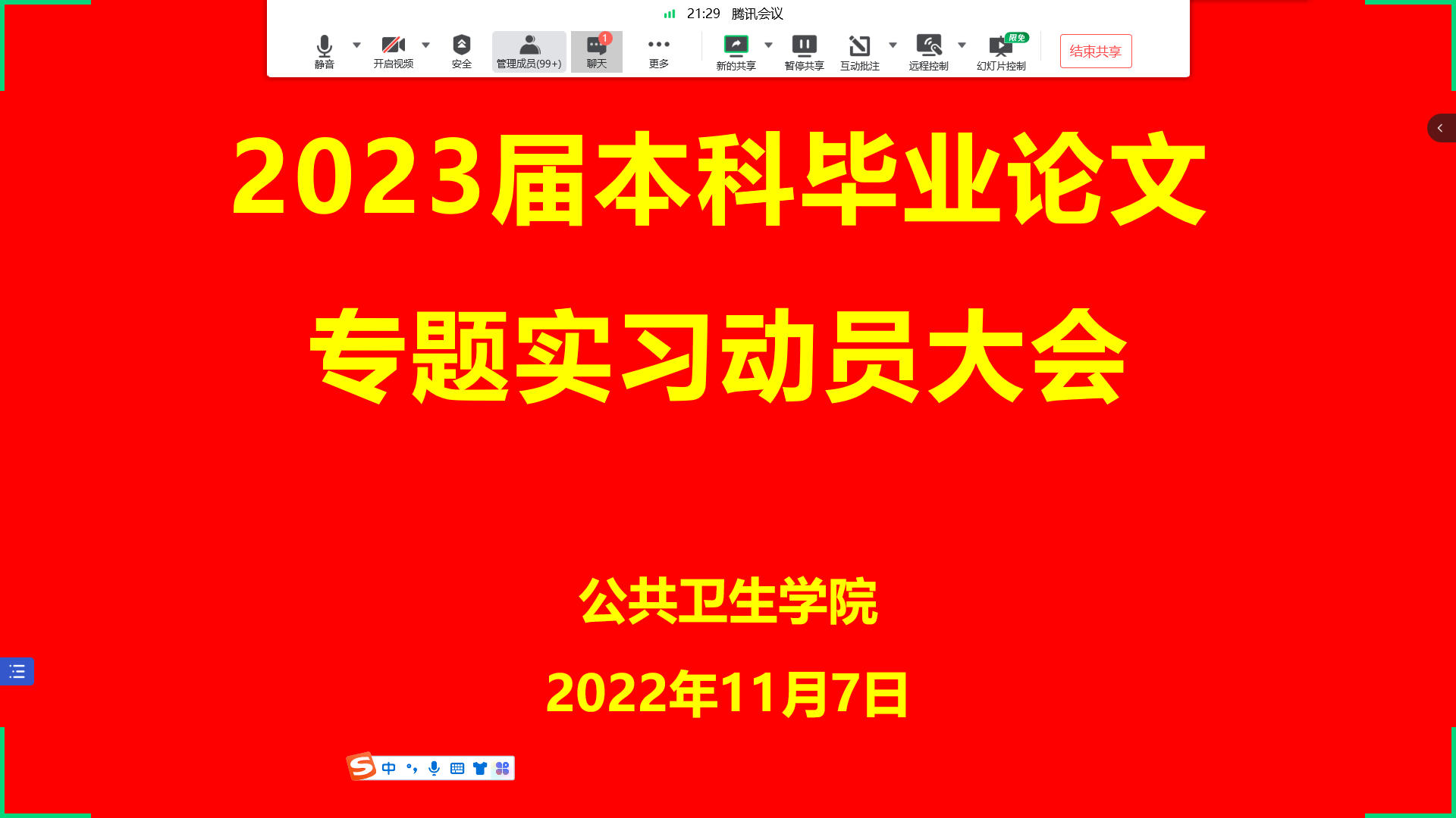 为进一步提升公司教学质量,强化学术诚信教育,加强教学管理,公司开展了专题实习教育,于2022年11月7日下午通过腾讯会议在线召开了2023届本科毕业论文动员大会。本次会议由教学办主任于军晖主持,参加会议的有公司副经理张朝晖老师、实验中心主任杨胜园老师、预防医学系副主任周筱艳老师、卫生检验与检疫系副主任柏琴琴老师、学工办辅导员何朝辉老师,2018级预防医学专业全体员工、2019级卫生检验与检疫专业全体员工、船山公司2018级预防医学专业全体员工。
