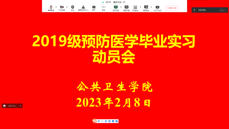 2023年2月8日上午,beats365采用腾讯会议的方式召开了2019级预防医学专业员工实习动员大会。会议由公司教学办主任于军晖主持,beats365副书记王超、副经理张朝晖、营养与食品卫生学教研室主任周筱艳、学工办辅导员何朝辉、船山公司教学办李小娥、辅导员何继江出席会议,beats365和船山公司2019级预防医学专业全体员工参加了会议。