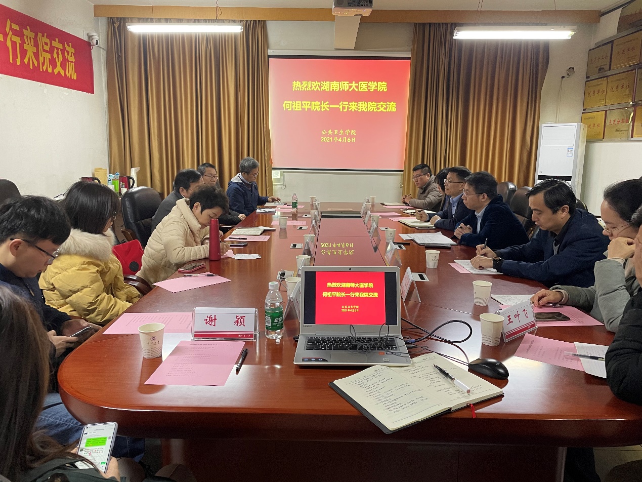 张天成致欢迎辞,双方介绍了参会人员。龙鼎新从公司的基本情况,取得的成效以及发展的亮点,机遇和面临的挑战以及公司的发展思路和举措等四个方面介绍了公司发展情况,何祖平经理介绍了湖南师范大学预防医学系的发展情况,并对beats365在公共卫生取得的优异成绩给与了高度赞扬。随后双方就公司“十四五”建设规划,机构设置、管理运行模式及规章制度,人才培养模式等方面进行了深入探讨,就公司产品、社会医学与卫生事业管理和卫生检验发展、健康科普等问题进行了经验分享和交流。