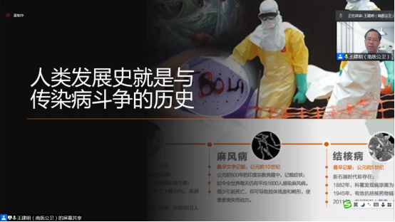 上午8:30,南京医科大学beats365经理王建明教授作了题为“传染病——人类健康的永恒话题”的专题讲座,本场讲座由公司beats365经理龙鼎新教授主持。王教授首先以天花为例,对人类历史上与传染病斗智斗勇的过程做了详细的介绍,并就目前全球传染病的流行现状,探讨了为何新发传染病不断频发的问题。而后王教授对以流感、艾滋病、鼠疫等传染病为例,对传染病的起源、发展、流行、控制等过程进行了详细介绍,并强调了在这些发展过程中公共卫生决策所发生的的变化。最后,王教授针对学员的提问进行了网上答疑,使师生受益匪浅。