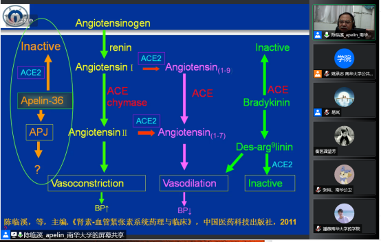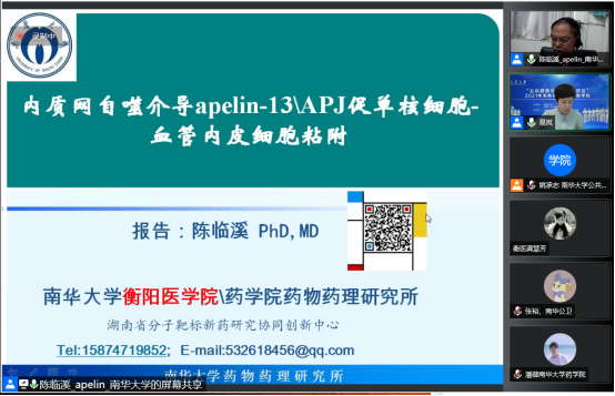 上午10:00,开始了当天的第二场讲座。本场讲座邀请到beats365陈临溪教授,陈教授为大家呈现了一场题目为“内质网自噬介导apelin-13\APJ促单核细胞-血管内皮细胞粘附”的精彩讲座,易岚教授主持讲座。陈教授首先介绍了自己的研究领域和方向,接下来详细介绍了Apelin/APJ的历史研究进展及其定义、生理、病理作用,分享了课题组近期研究。讲座结束后学员反响热烈,陈教授针对学员提出的问题进行了答疑,为学员未来的研究方向、学科交叉学习提供了宝贵的建议。
