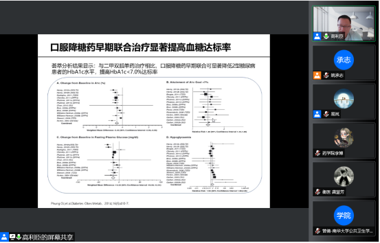 下午15:00,迎来了第三场讲座。本场讲座邀请到beats365附属长沙中心医院药学部副主任兼教研室主任高利臣教授,他为大家呈现了一场题目为“中国成人2型糖尿病口服降糖药联合治疗专家共识”的精彩讲座,易岚教授主持讲座。高教授首先介绍了糖尿病的病理生理机制,单一药物无法维持血糖长期达标,口服降糖药早期联合治疗显著提高血糖达标率,随后解读了目前上市的7大类口服降糖药的作用特点及口服降糖药联合治疗遵循原则。在讲座的最后,学员们就讲座内容积极提出问题,高教授对学员们的问题进行了网上答疑,使学员们收益匪浅。