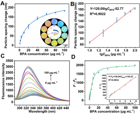 肖福兵课题组利用聚乙二醇二丙烯酸酯(PEGDA)作为共价交联网络以及β-环糊精(β-CD)和叔丁基(t-Bu)的主客体复合物作为非共价交联网络构建二维光子晶体双交联超分子水凝胶(2DPCDCSH)。由于BPA与β-CD的结合能力比t-Bu的强,以BPA为竞争性客体,破坏了β-CD与t-Bu之间的主客体相互作用,导致水凝胶的交联密度降低而发生膨胀,进而引发二维光子晶体颗粒间距增加和衍射波长红移。通过测量德拜衍射环直径或观察二维光子晶体颜色变化,即可实现对BPA的灵敏检测(检测限1 μg mL -1)。此外,BPA具有自发荧光,但是其荧光效率较低。然而,β-CD/BPA主客体复合物的形成可显著增强BPA的荧光强度,因此荧光可以作为另一种信号,用于BPA的灵敏检测(检测限为0.001 μg mL-1)。比色和荧光检测体系可以共用反应条件,不会相互干扰,并可以得到比单一信号体系更宽的检测范围。本研究所提出的双信号传感方法为BPA的高效检测提供了新方法,并为多样化传感平台的设计提供了新思路。