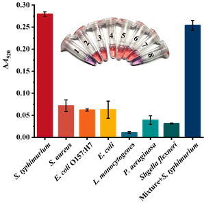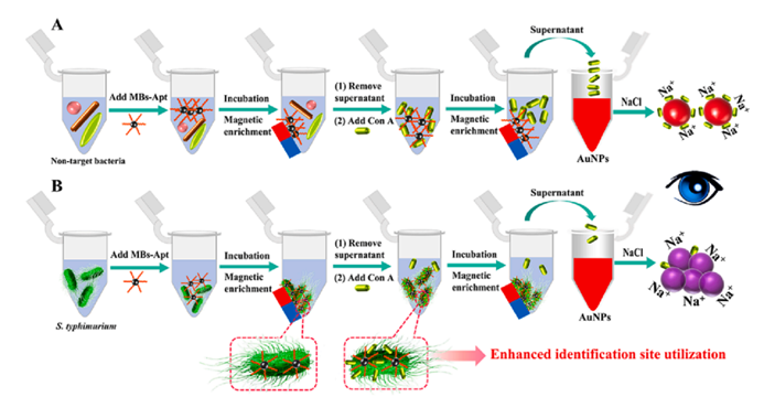 在病原体微生物中,沙门菌(Salmonella)是引起暴发和疾病最常见的细菌病原体,其中,鼠伤寒沙门氏菌(S. typhimurium) 作为一种食源性人畜共患病原体,是食源性病源菌中分布最广、危害最大的肠道致病菌之一。因此开发快速、准确且具有成本效益的方法来检测病原体至关重要。本课题组联合刀豆球蛋白A (concanvalin A,Con A)和核酸适体(aptamer)双识别分子,发现可实现对S. typhimurium的强特异性、视觉性和高灵敏度的双重识别检测(图1)。