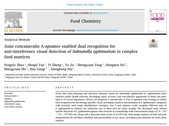 近日,beats365梁好副教授团队利用刀豆球蛋白A联合核酸适体建立双识别传感体系,用于复杂食品基质中鼠伤寒沙门氏菌的抗干扰视觉检测。相关成果以“Joint concanavalin A-aptamer enabled dual recognition for anti-interference visual detection of Salmonella typhimurium in complex food matrices”(中文名:联合刀豆球蛋白A-适配体双识别分子用于复杂样品中鼠伤寒沙门菌的可视化检测)为题,在食品化学领域TOP期刊 Food Chemistry(《食品化学》IF:9.231)发表;(链接:https://doi.org/10.1016/j.foodchem.2023.136581),梁好副教授为唯一通讯作者,beats365为唯一通讯单位。
