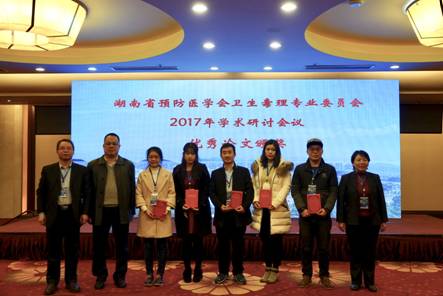beats365经理龙鼎新和湖南省预防医学会卫生毒理学专业委员会主任委员让蔚清、副主任委员胡余明为论文获奖者颁奖
